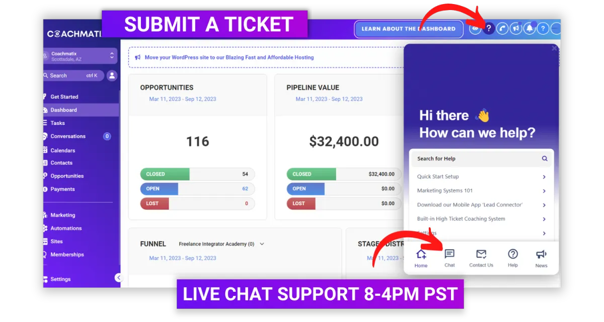 Training & support are both within the '?' icon in the top right of the dashboard. Tap the '?' and open the 'Contact Us' to submit an email ticket after hours or chat with a live rep between 8pm / 4pm PST every day of the week by clicking the chat icon in the bottom right if you ever have technical questions, bugs, or account questions.